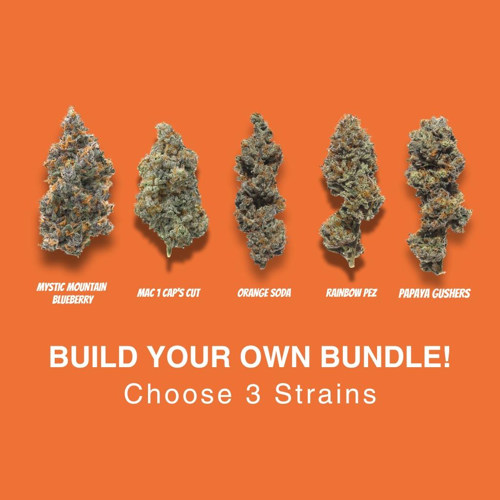 This exclusive strain bundle lets you customize your experience by choosing 3 of our 5 living soil grown strains. Try 2g of 3 strains for a total of 6g-- this bundle lets you explore bold flavors, rich terpene profiles, and smooth, potent effects—all cultivated using award-winning living soil techniques. Perfect for those who want to try them all, this bundle delivers frosty, terpene-packed flower with unmatched quality.