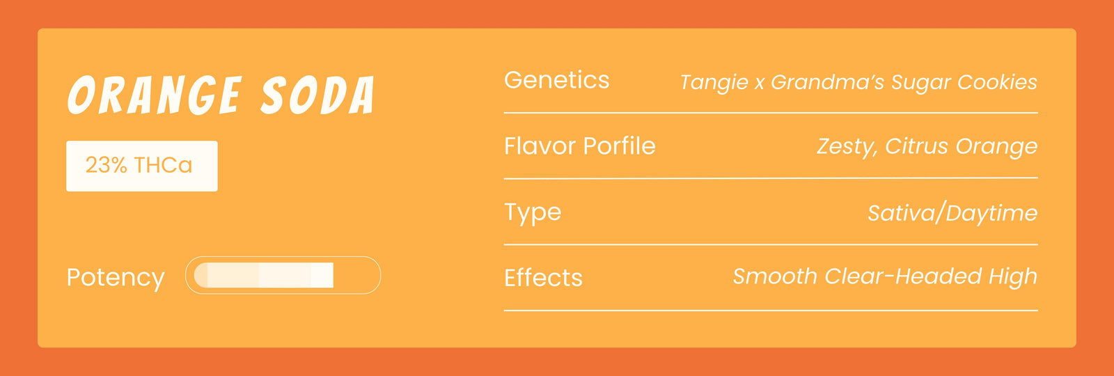 Orange Soda, a cross of Tangie x Grandma's Sugar Cookies, delivers a terp-heavy profile thats nothing but nostalgic. Crack a jar and you’ll swear you just opened a cold can of orange pop. Bright, bubbly, and uplifting, Orange Soda delivers a smooth, clear-headed vibe that’s perfect for daytime sessions.