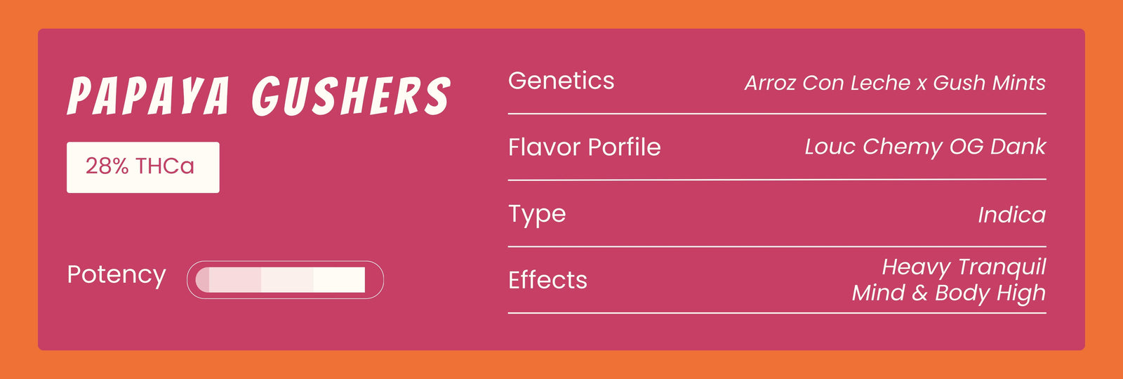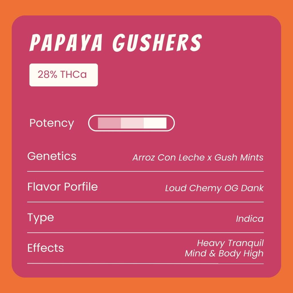 Papaya Gushers, a cross of Arroz Con Leche x Gush Mints, delivers that loud, chemy OG dank. This flavorful indica delivers a heavy, tranquil mind & body high, ideal for evening chill sessions or easing into a restful night.